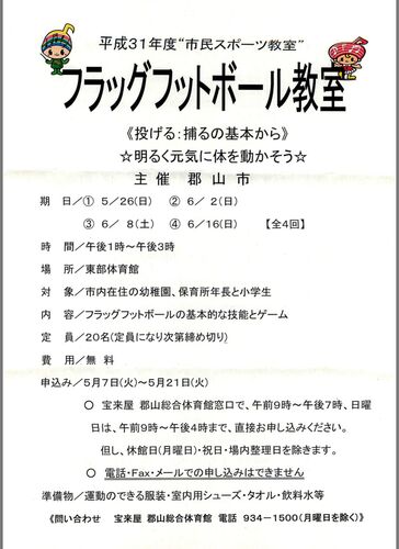 今回は、郡山フラッグ協会が開催した子ども教室をちょっぴりご紹介します。(企画協力:スペックスフットボール) のびのび!親子体験 <主催:郡山市教育委員会> わくわくこども大学 <主催:郡山女子大学> 三春フラッグゲーム <主催:三春町児童生活セ…